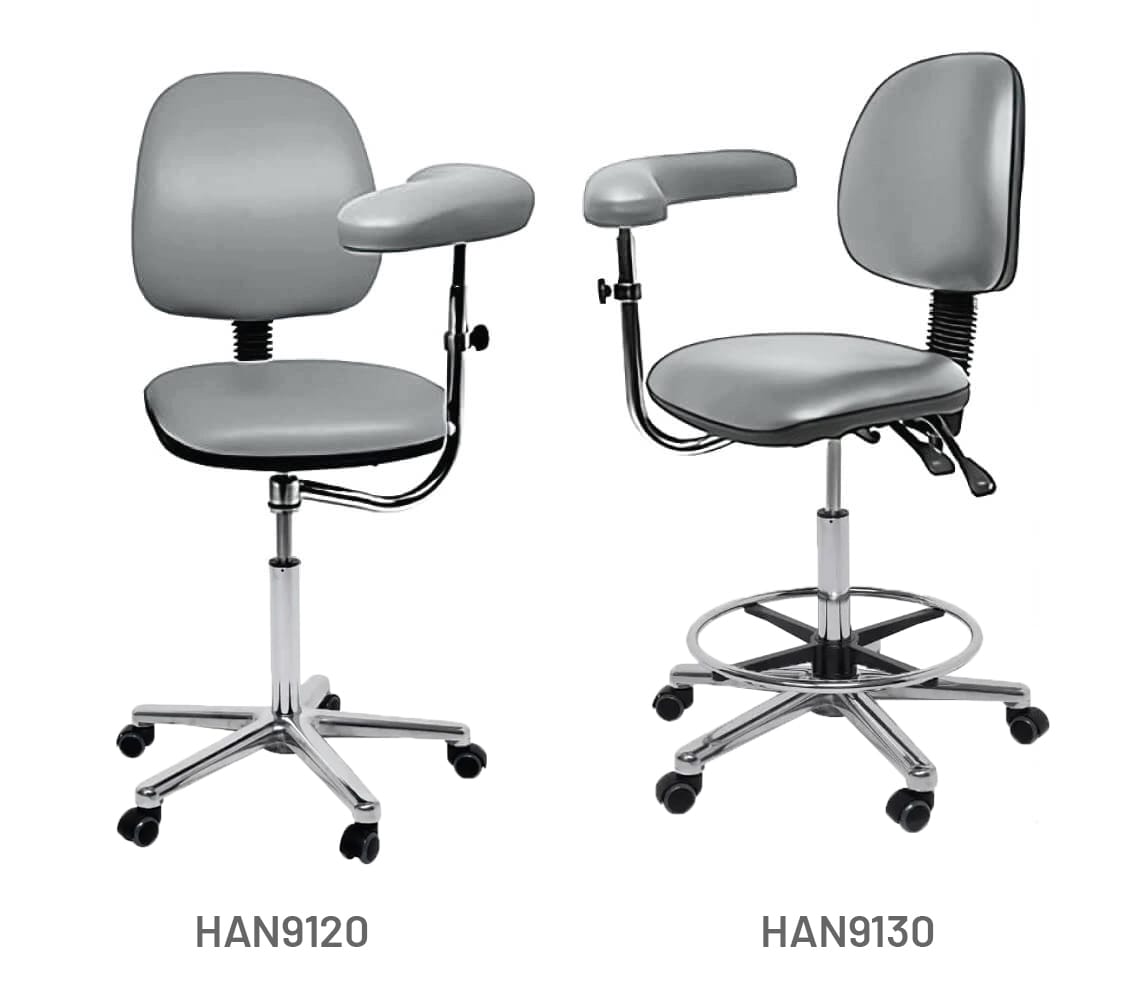 These Traditional High Back Chairs with Torso Arms feature comfortable, contoured back support with dual adjustment, a pneumatic height adjustment, a chrome base with hard, free-wheeling castor wheels and a full 360° range of motion. These luxury high-back chairs are available in a choice of versatile and hardwearing anti-microbial vinyl upholstery colours. Lastly, this traditional chair features a height-adjustable torso/arm that can provide comfort and support during time-intensive or intricate procedures.